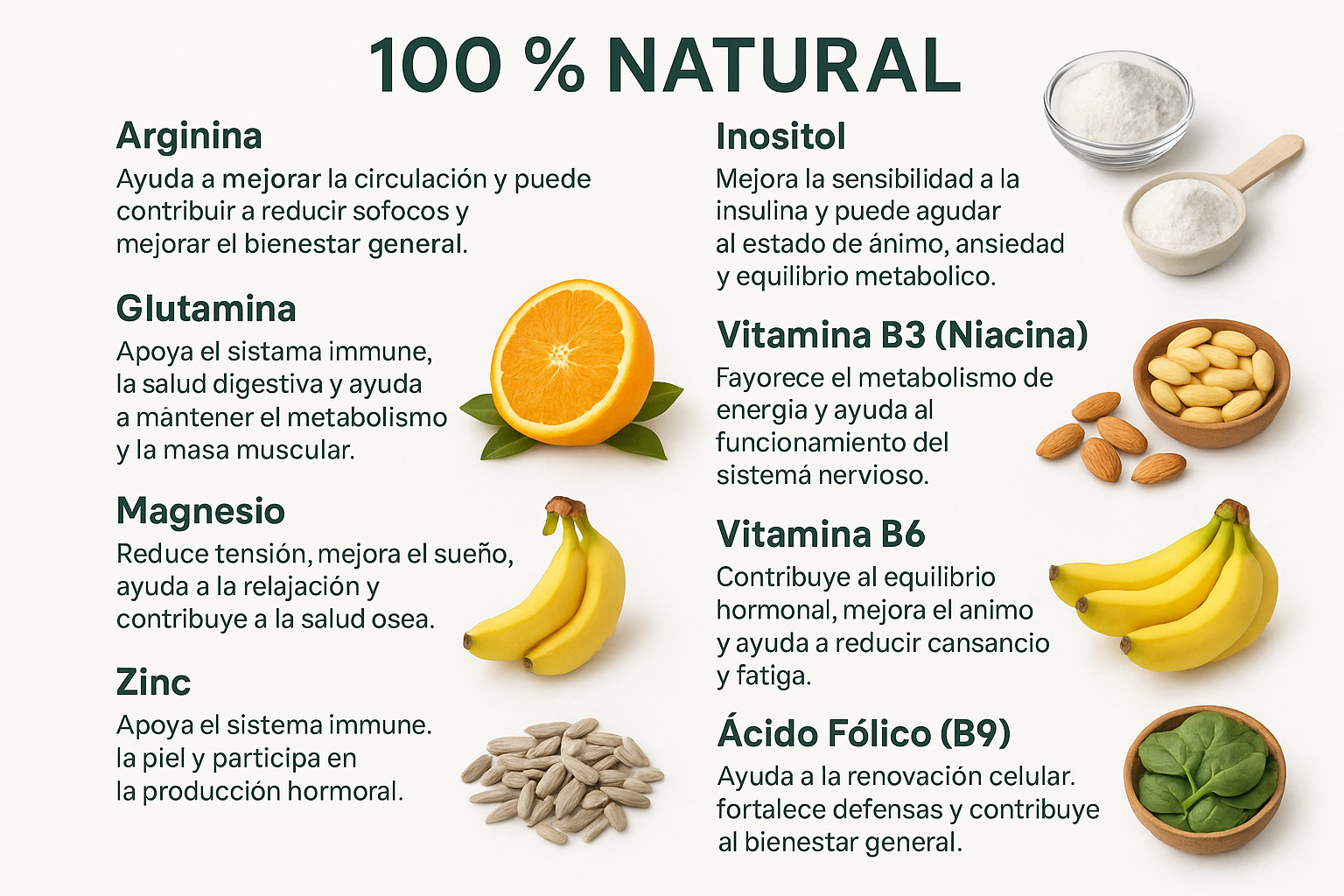 Contribuye al equilibrio hormonal, mejora el ánimo y ayuda a reducir cansancio y fatiga.